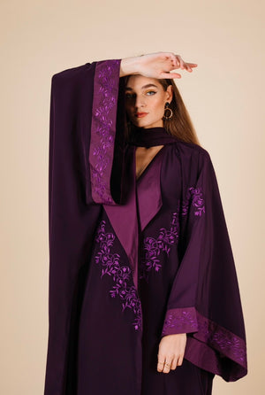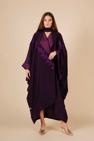 Inspired by traditional kimono lines, this plum-hued ensemble is crafted from rich crepe and structured taffeta. Embroidered accents add subtle texture to its sleek silhouette, while wide sleeves and architectural draping deliver a sculptural elegance. A statement in poised refinement.