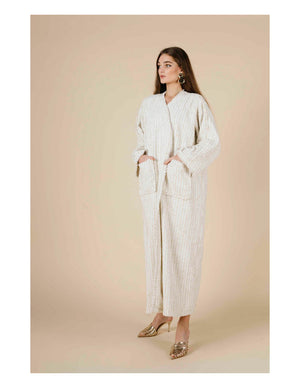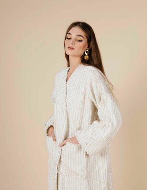 Step into refined sophistication with this beautifully crafted ivory abaya. Designed with a luxurious textured fabric that exudes understated glamour, this open-front piece features wide sleeves and practical front pockets for a blend of comfort and style. Its minimalist silhouette is perfect for both casual and formal occasions, offering a timeless addition to your modest wardrobe. Pair with statement earrings and heels for a graceful finish.