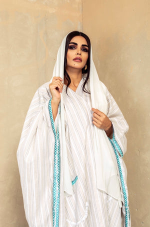 Effortlessly chic, this Bisht-inspired abaya is crafted from breathable beige striped linen for an airy, tailored silhouette. It features intricate arctic-blue embroidery tracing the edges and shoulders, beautifully contrasted by delicate fringed trim that adds a playful movement to each step. A matching chiffon sheila completes the ensemble—ideal for a stylish, modern take on traditional wear.