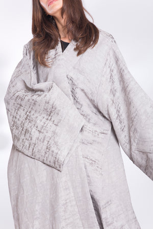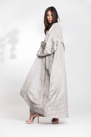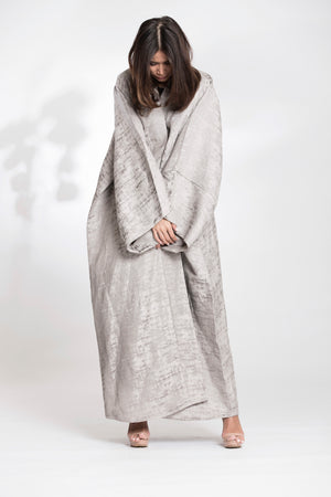 Tailored from a rich, woolen ash-grey fabric, this piece blends structure with fluidity. Wide lapels and softened lines frame the body, while its extended silhouette evokes quiet drama. Understated yet refined, it’s designed for the woman who commands attention without a word — timeless, sculptural, and effortlessly modern.