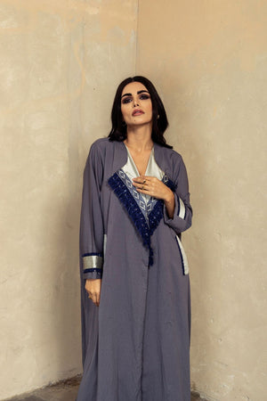Crafted from washed heather-toned silk, this sculptural coat features a V-front placket detailed with geometric embroidery, silver taffeta trim, and subtle tweed-inspired fringes. The dropped shoulders and relaxed silhouette combine effortless comfort with refined structure. Paired with a plain chiffon headscarf, it offers a truly elevated take on modern modesty.