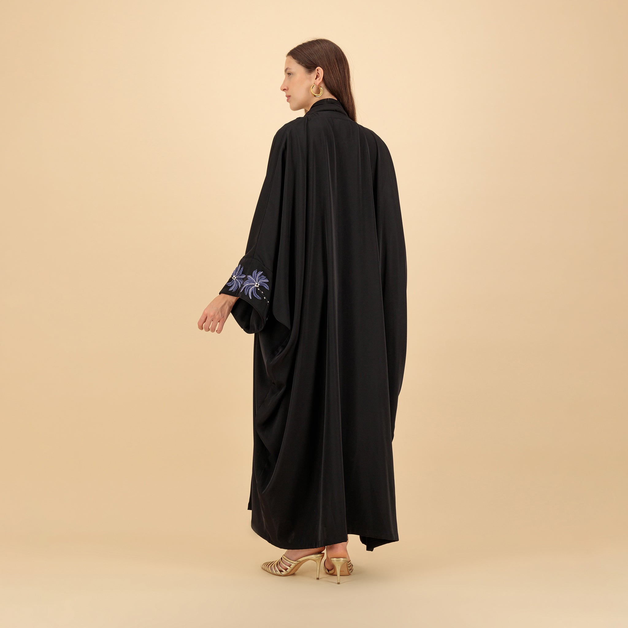 This black crepe abaya features delicate palm tree embroidery in soft purple tones on the sleeves, blending tradition with a fresh, contemporary touch. Its flowing silhouette and lightweight fabric offer elegance and ease, ideal for both casual and formal occasions. Pair it with minimal accessories for a refined, modern look.