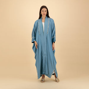 Step into serene elegance with the Celestial Mist Embellished Abaya — a flowing