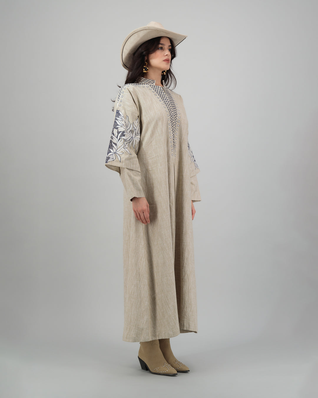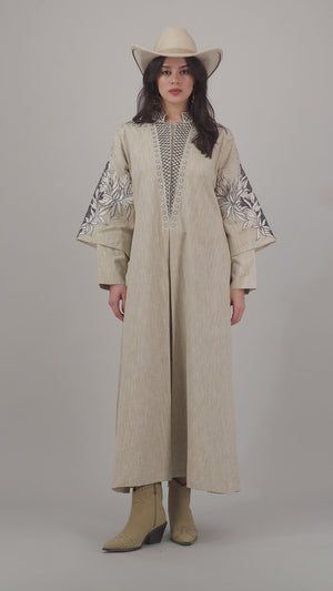 Step into understated elegance with this ethereal cream-toned linen abaya, subtly enhanced by intricate sky-blue leaf-and-floral embroidery along the sleeves and front panels. Gently structured yet flowing, its relaxed silhouette offers both comfort and refined sophistication. Includes a lightweight chiffon headscarf for a polished, cohesive ensemble. Ideal for Ramadan gatherings or any occasion where serene style meets modern modesty.
