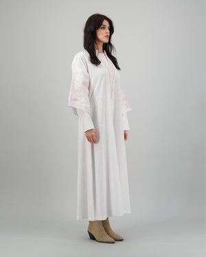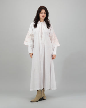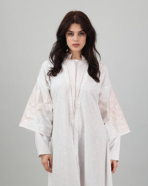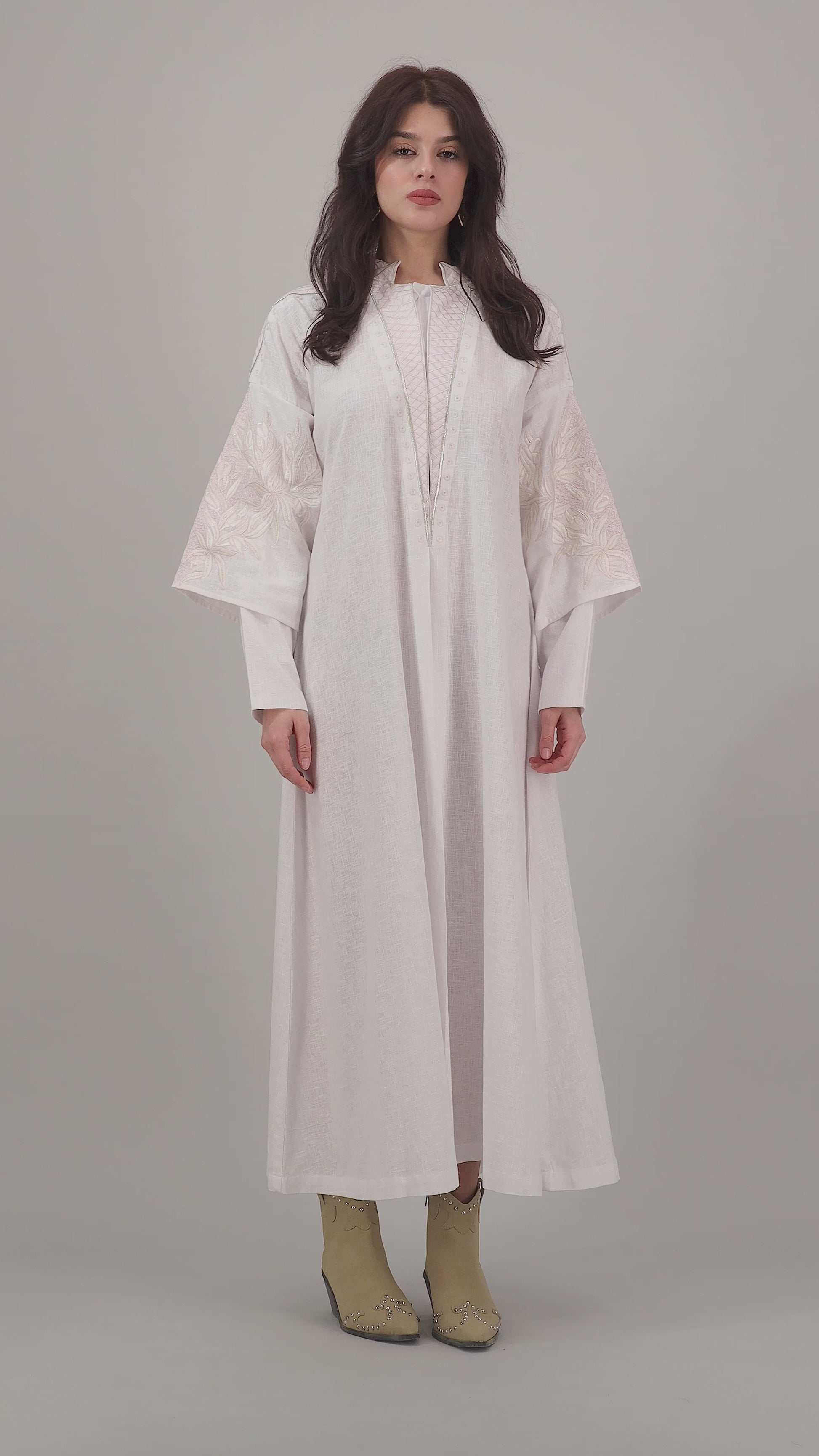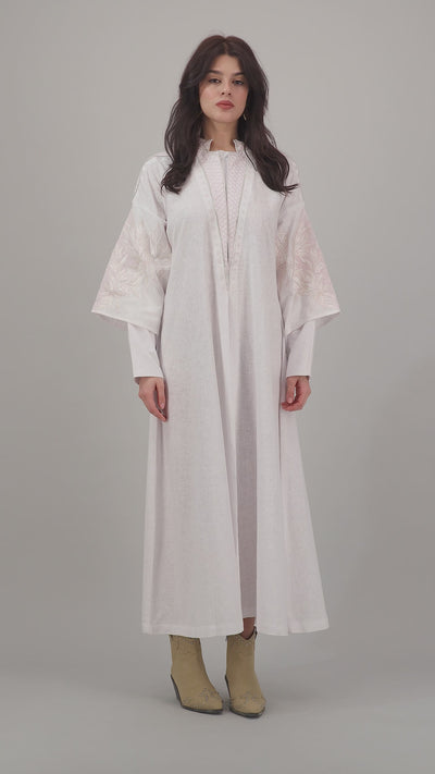 This refined white linen kaftan features a flowy, feminine silhouette and wide bell sleeves. Delicate pink leaf and floral embroidery adorns the sleeves and front panel, adding a soft romantic touch. Lightweight and breathable, it's perfect for warm-weather elegance—ideal for casual chic or elevated daytime occasions.