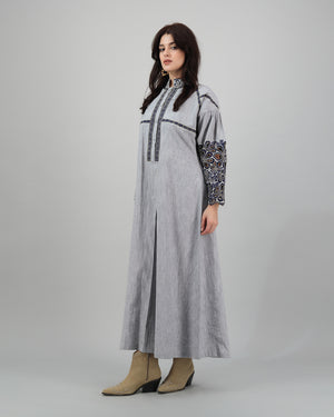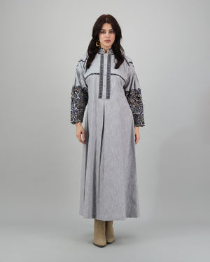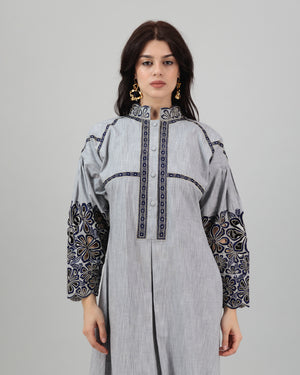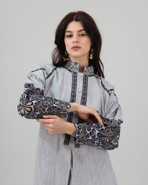 Step into effortless elegance with this light blue-toned linen kaftan, designed for comfort and refined style. The soft striped texture adds depth, while the standout feature—floral sleeve artwork in bold black and blue embroidery—adds a touch of artisanal sophistication. Finished with a structured collar and front detailing, this piece seamlessly blends traditional design with a contemporary silhouette.