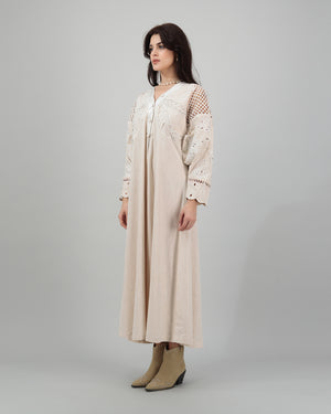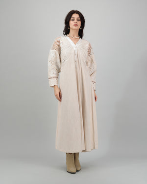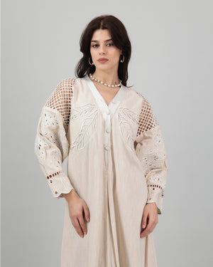 Cream Linen Kaftan with Leaf & Floral Cutwork