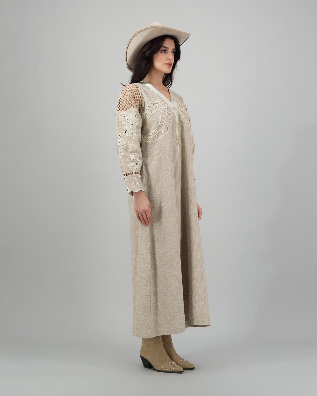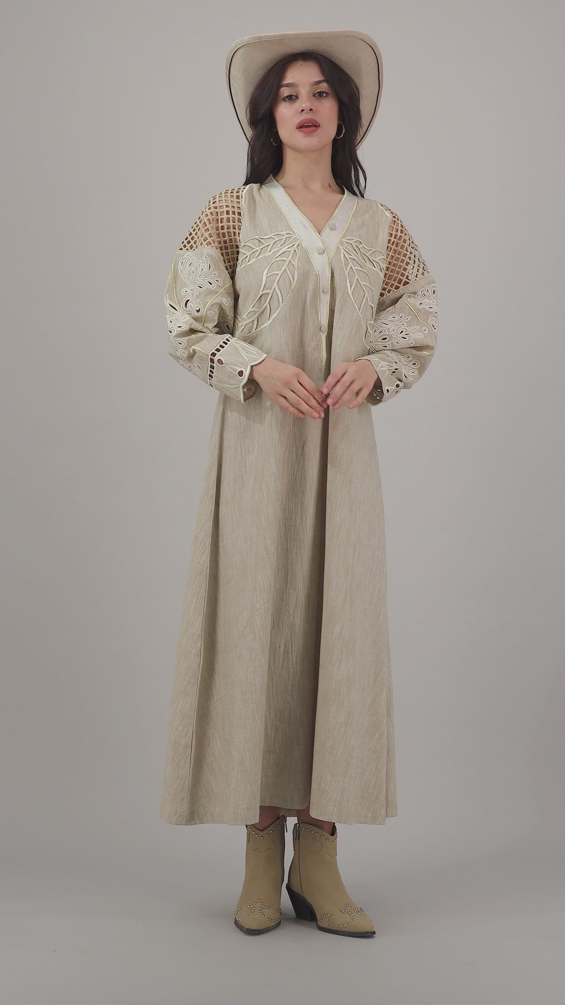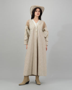 Beige Linen Kaftan with Delicate Leaf & Floral Cutwork