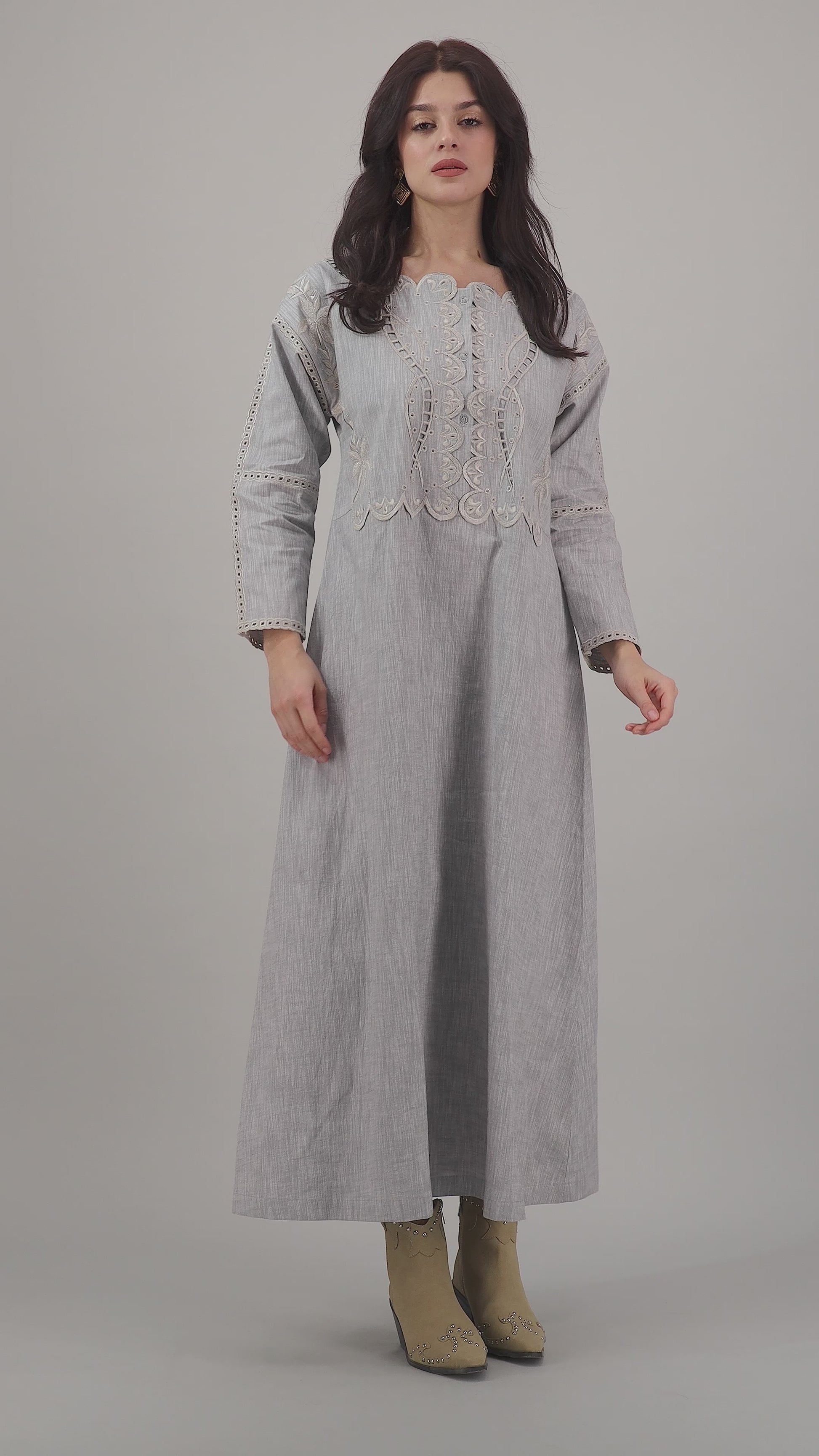 Crafted from gray-toned linen, this elegant Ramadan kaftan showcases integrated silver embroidery in delicate leaf and floral patterns. A perfect balance of earthy sophistication and modern modesty, it offers a graceful silhouette ideal for Iftar gatherings, Eid celebrations, and serene Ramadan evenings. The lightweight, breathable fabric ensures lasting comfort while maintaining effortless elegance throughout the season.