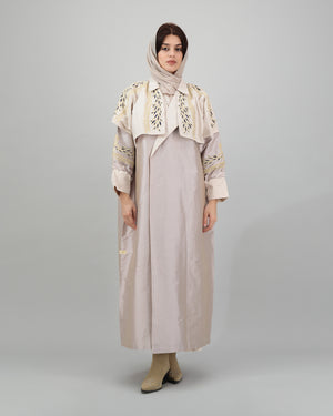Subtle drama in soft bisque tones. Lightweight linen panels drape effortlessly over a sleek inner silhouette, enhanced by sculpted details on cuffs and bodice. Paired with a tonal chiffon veil, this set redefines minimalism with architectural elegance—perfect for a modern, refined statement.