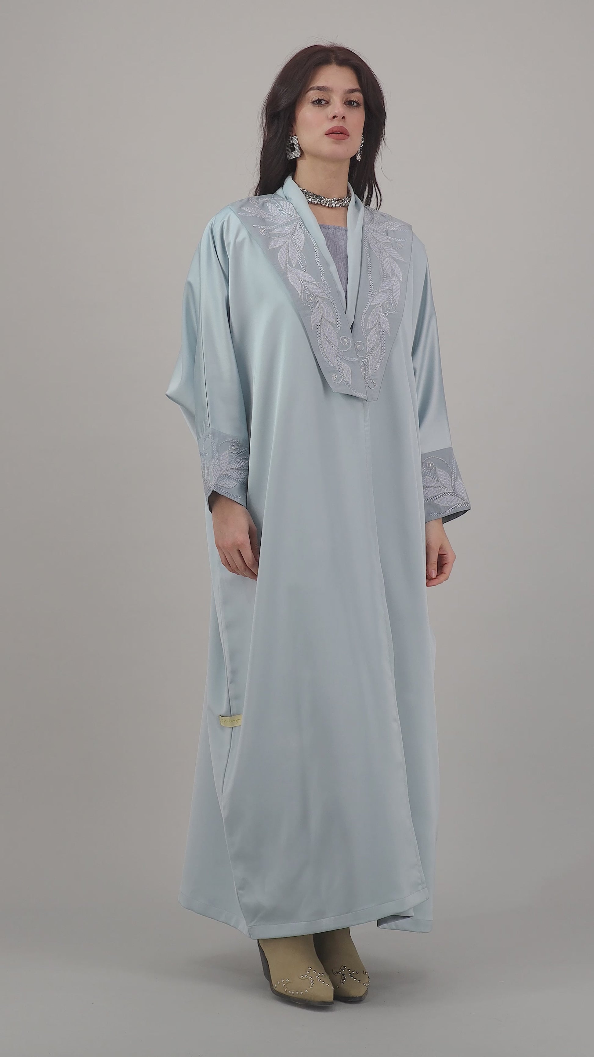 This elegant powder blue abaya is designed with delicately embroidered accents along the collar and cuffs, adding a sophisticated touch to its flowing silhouette. The soft satin finish enhances its graceful movement, making it ideal for both daytime gatherings and evening affairs. Complete the look with a complementary sheila and statement jewelry.