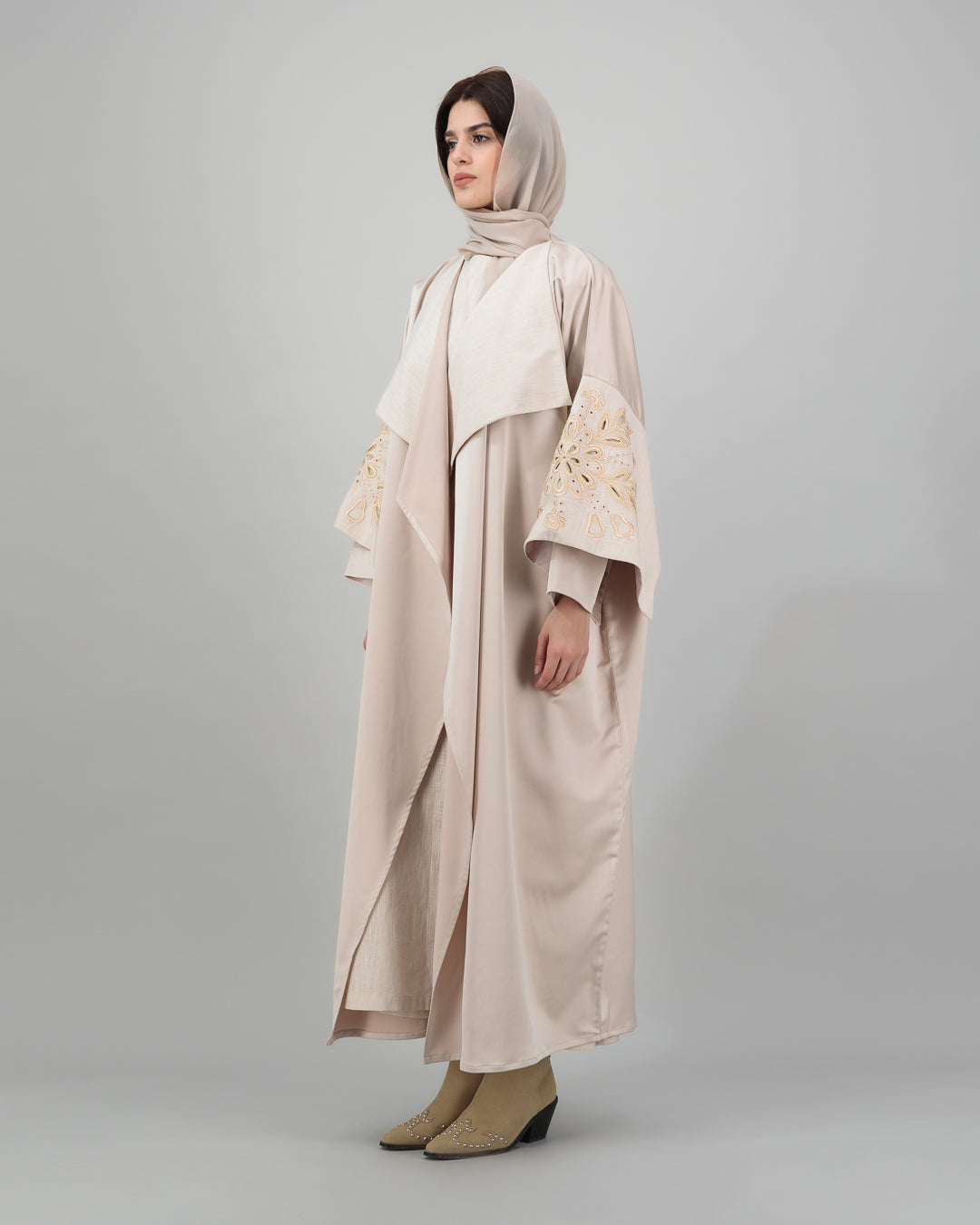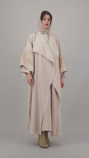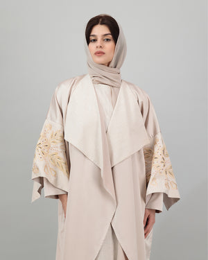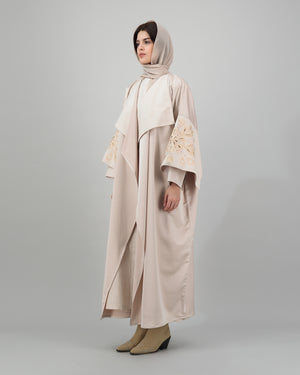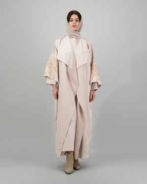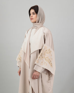 Soft and graceful, this blush beige open abaya features wide lapels and beautifully embroidered golden motifs on the sleeves, adding a radiant accent to the neutral palette. The flowing silhouette is both modest and elegant, making it ideal for both daytime sophistication and evening refinement. Complete with a matching sheila for a polished, coordinated look.
