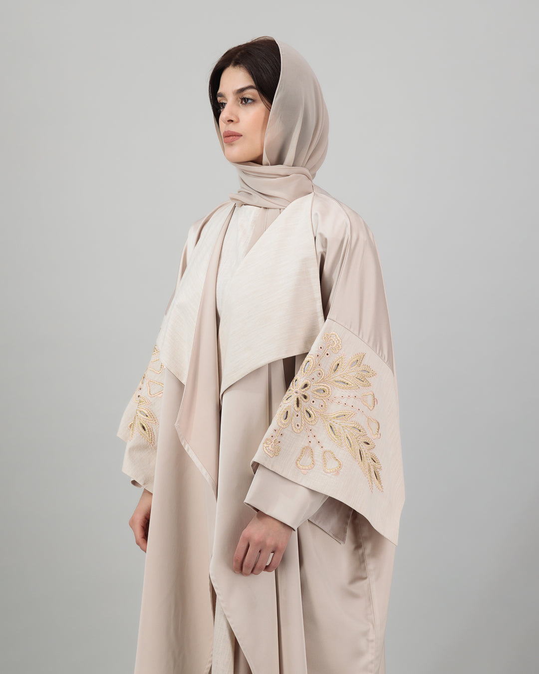 Blush Beige Abaya with Golden Embroidered Sleeves
