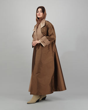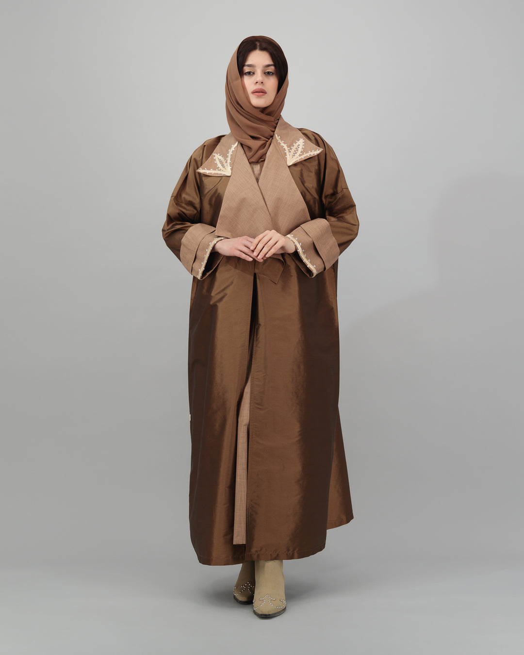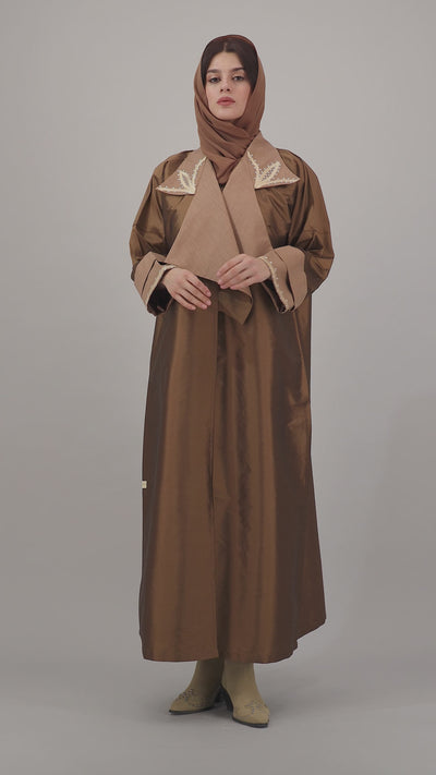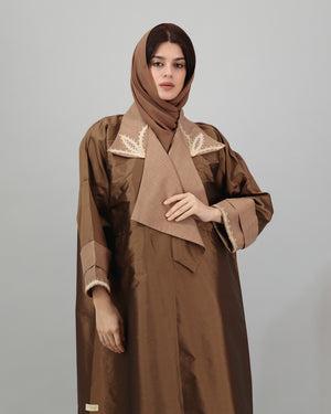 Exude refined elegance in this chocolate brown abaya, crafted from a subtly lustrous fabric that offers a smooth, polished look. The standout feature is its wide, embroidered lapel and sleeve cuffs adorned with delicate golden threadwork. A coordinating scarf completes the look, making it an ideal choice for formal and evening occasions.