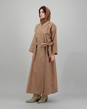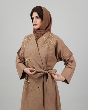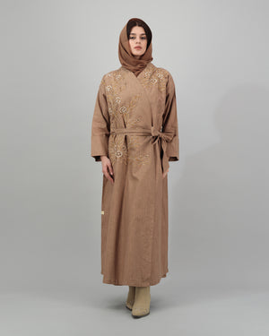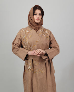 Earthy Brown Abaya with Embroidered Foliage and Waist Tie