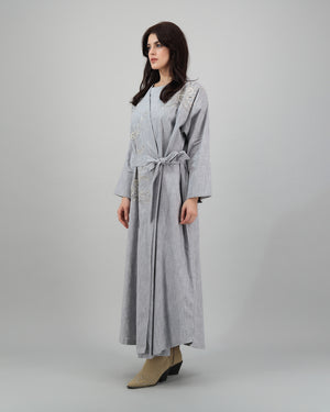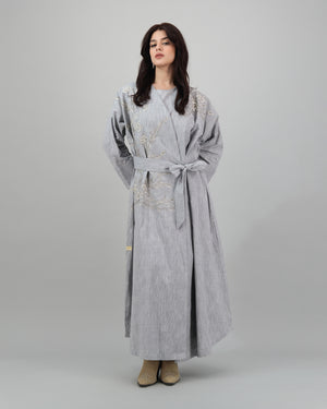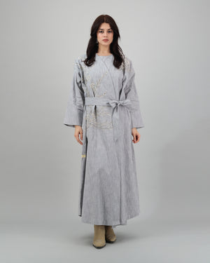 This soft grey abaya showcases a subtle pinstripe texture and is beautifully adorned with delicate floral embroidery in ivory and gold tones. Featuring a wrap-style front and a self-tie waist belt, it offers both comfort and tailored elegance. The lightweight fabric and full-length sleeves make it perfect for versatile, modest styling throughout the day.