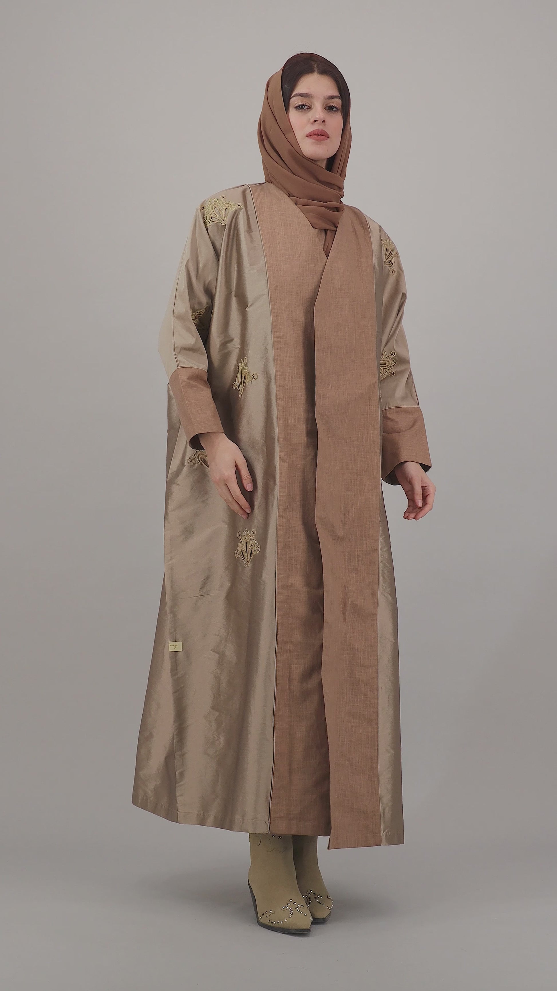 A refined composition of matte and lustrous textures, this elegant abaya features a dual-tone bronze palette and delicate embroidery accents. The structured silhouette and subtle contrast create a look of composed luxury, ideal for elevating your everyday elegance or making a graceful evening statement.