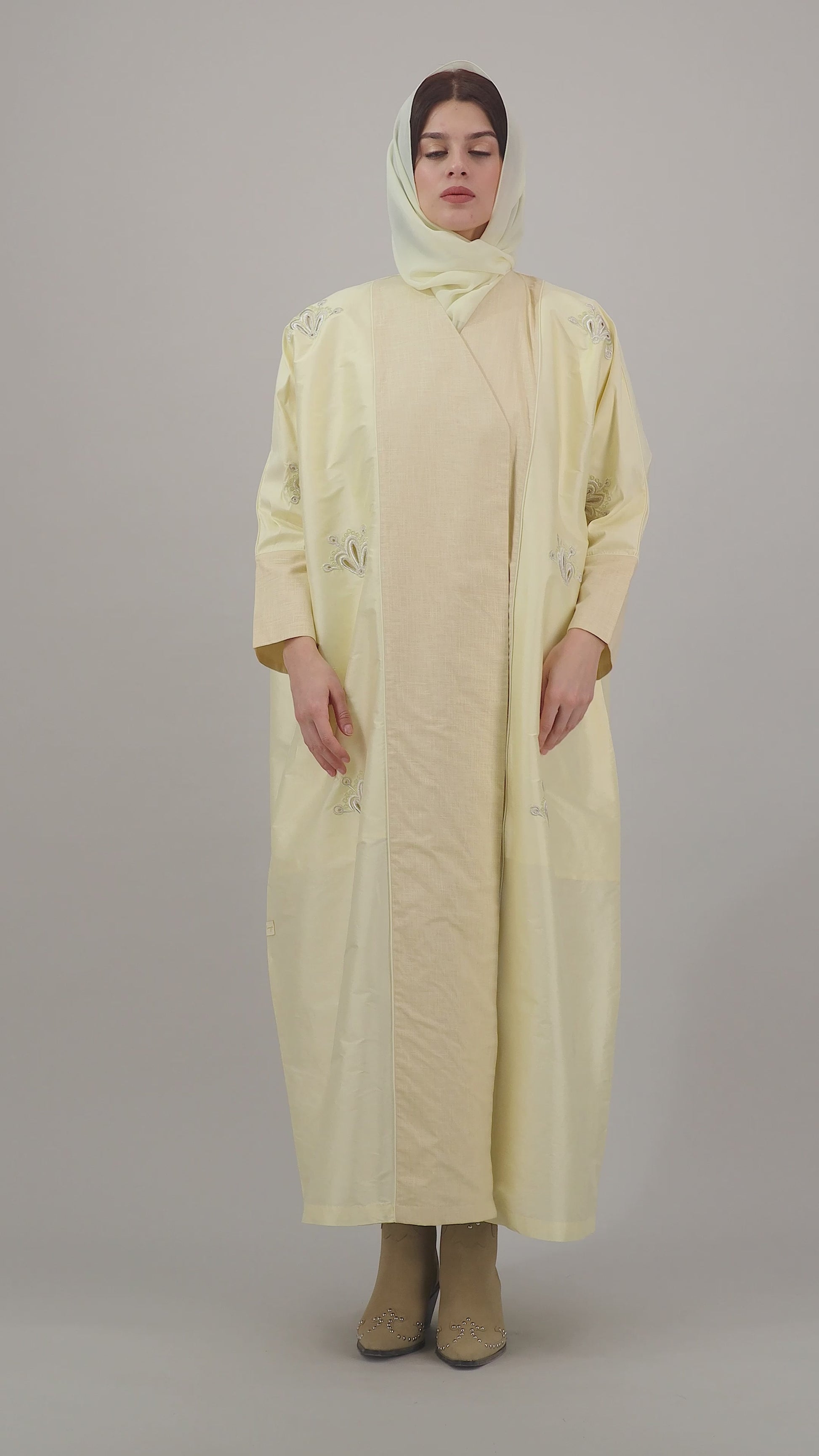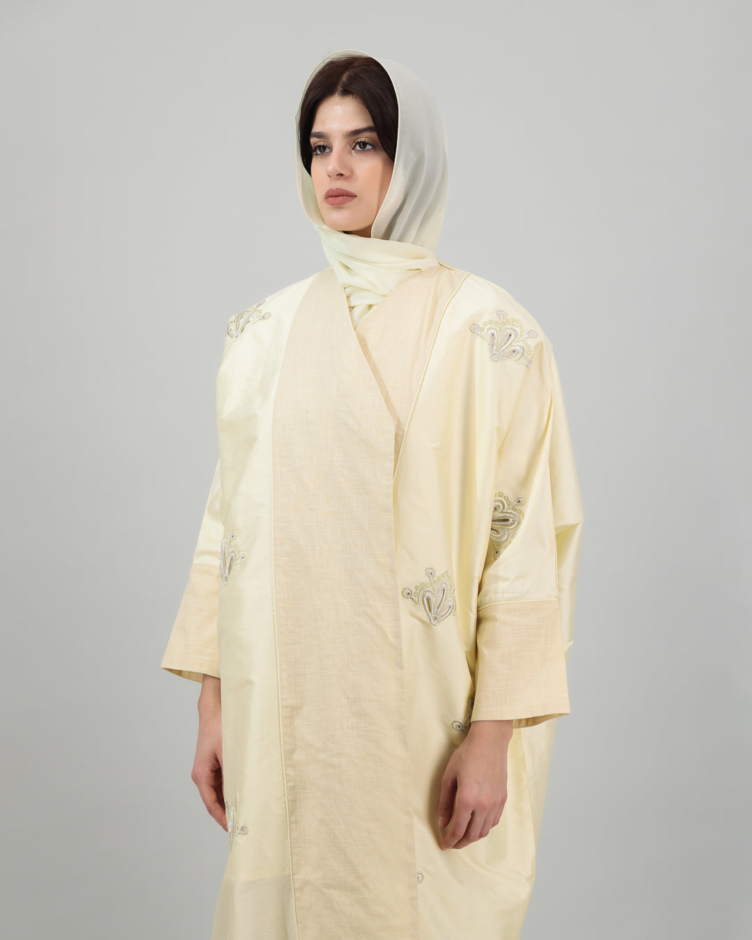 Experience understated elegance with this luxurious bisque-toned taffeta and linen ensemble. Featuring exquisite floral embroidery delicately adorning the neckline and sleeves, it blends classic craftsmanship with modern minimalism. Paired with a flowing plain chiffon headscarf, this piece offers a refined silhouette and breathable comfort — perfect for sophisticated occasions where effortless style meets timeless grace.