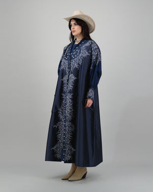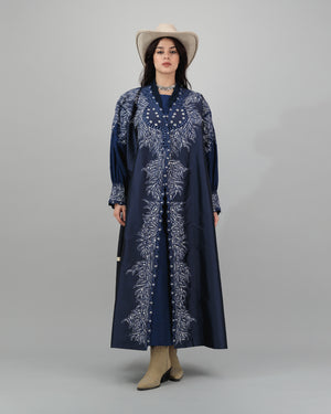 Make a bold statement with this navy abaya, featuring intricate white embroidery and metallic eyelet accents. The flowing silhouette is enhanced with a front-button design and puffed sleeves for a touch of drama. Styled with a cowboy hat and boots, this look fuses traditional grace with modern Western flair—perfect for the fashion-forward woman seeking a unique edge.