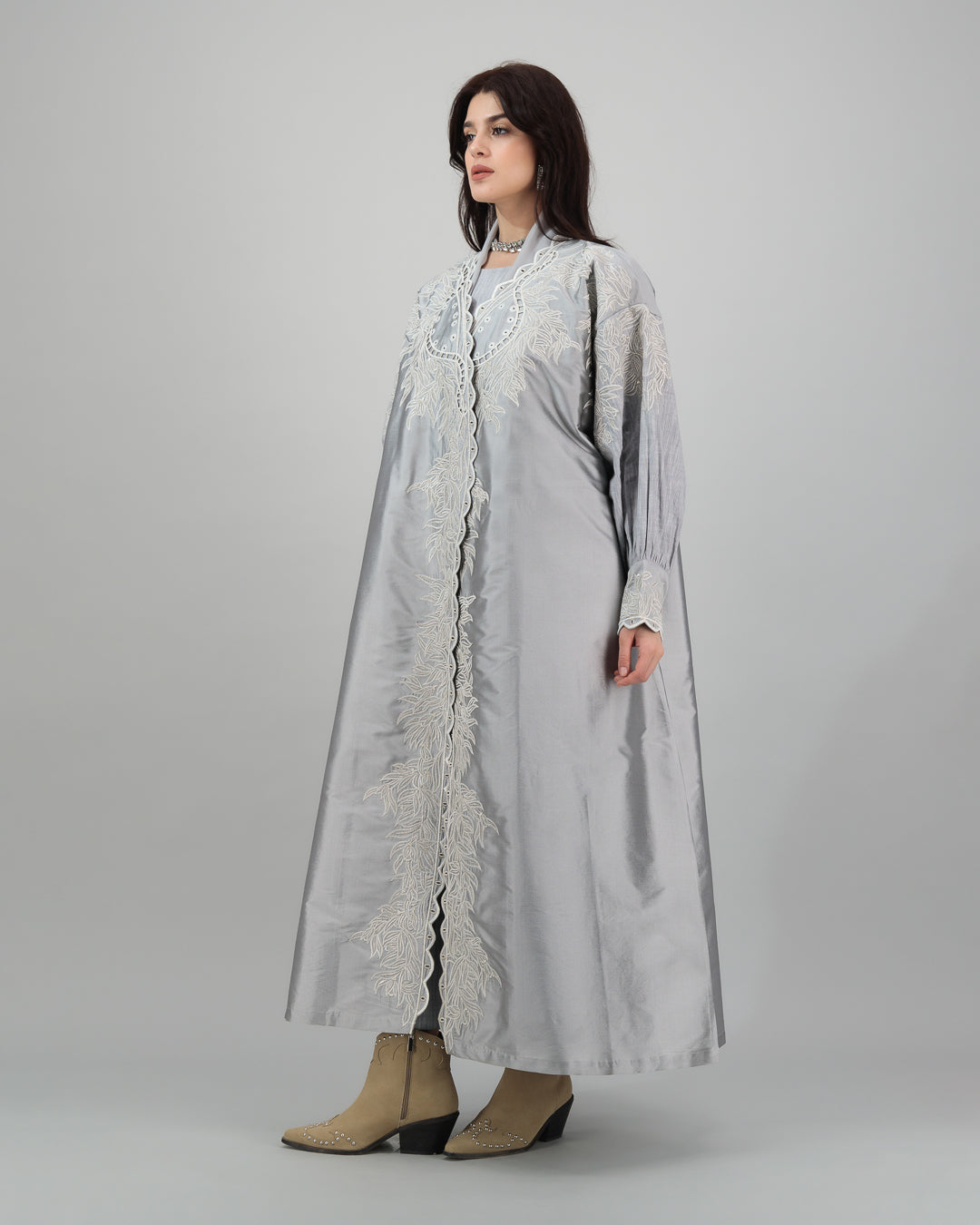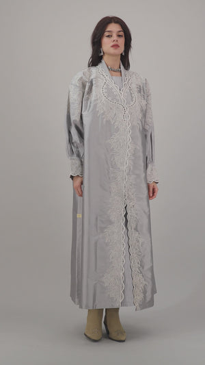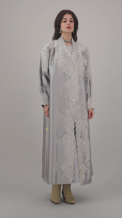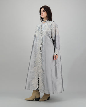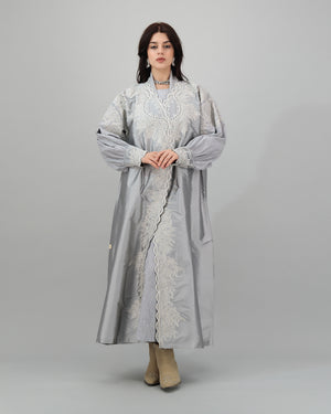 Radiate grace in this luminous silver abaya adorned with intricate ivory embroidery and elegant scalloped edging. The voluminous sleeves and structured silhouette offer a refined, regal look, while the delicate patterns lend a touch of femininity. Perfect for formal gatherings or elevated everyday wear, this piece exudes understated luxury with a modern twist.