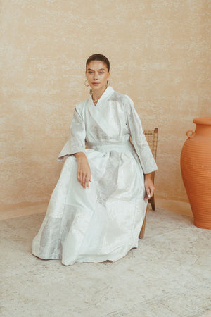 Gracefully blending tradition with contemporary style, this ivory brocade dress features a kimono-inspired wrap silhouette and intricate patchwork detailing. The rich brocade fabric lends a subtle sheen and texture, enhancing its refined appeal. With wide sleeves, a defined waist, and an effortlessly flowing skirt, this piece is perfect for elegant occasions where comfort meets understated luxury. A standout choice for those who appreciate timeless design with artisanal depth.