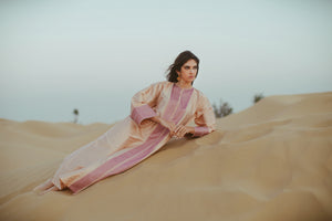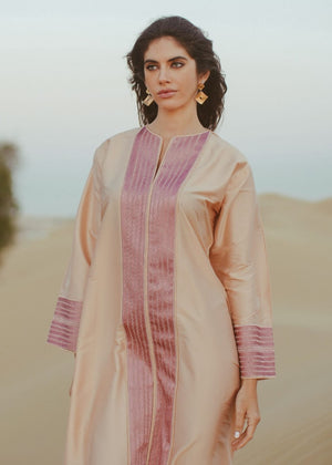 A stylish Jalabiya comes in Peach Tafeeta fabric with Rose stripe embroidery