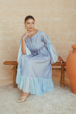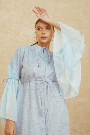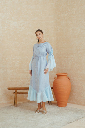 Embrace elegance with a touch of playfulness in the Celeste Breeze Ruffle Hem Dress. This airy, light blue piece is crafted from a soft, breathable fabric perfect for spring and summer days. Featuring dreamy layered bell sleeves and a flowy ruffled hem, it creates graceful movement with every step. A drawstring waist cinches delicately at the center, offering a flattering silhouette while maintaining comfort. Whether you're heading to a brunch, a resort getaway, or a sunset gathering, this dress adds charm and lightness to your wardrobe.