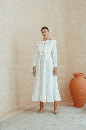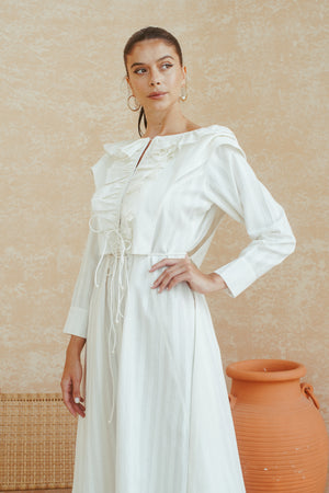 Step into effortless charm with this ethereal white dress featuring delicate stripes and a ruched bodice that ties at the waist for a flattering silhouette. The soft ruffle detailing along the hem adds a graceful flair, while the wide collar neckline lends a touch of vintage romance. Perfect for sunlit days or intimate evenings, this dress whispers elegance in every step.