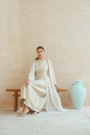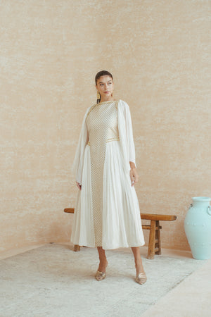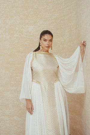 Ramadan Gown. This ethereal white dress features a stunning gold geometric