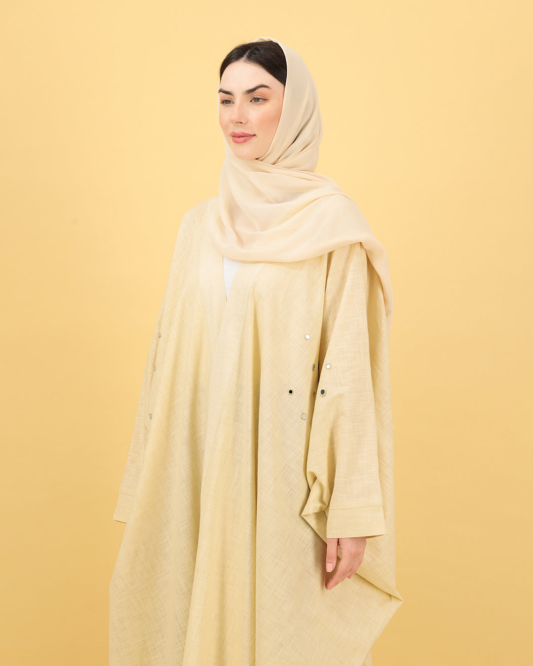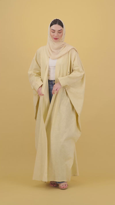 Drenched in a warm buttercream tone, this abaya radiates soft sophistication. The scattered metallic accents shimmer gently, mirroring the golden hour’s glow. Designed for elegance without effort, it brings a touch of sunshine to every step you take.