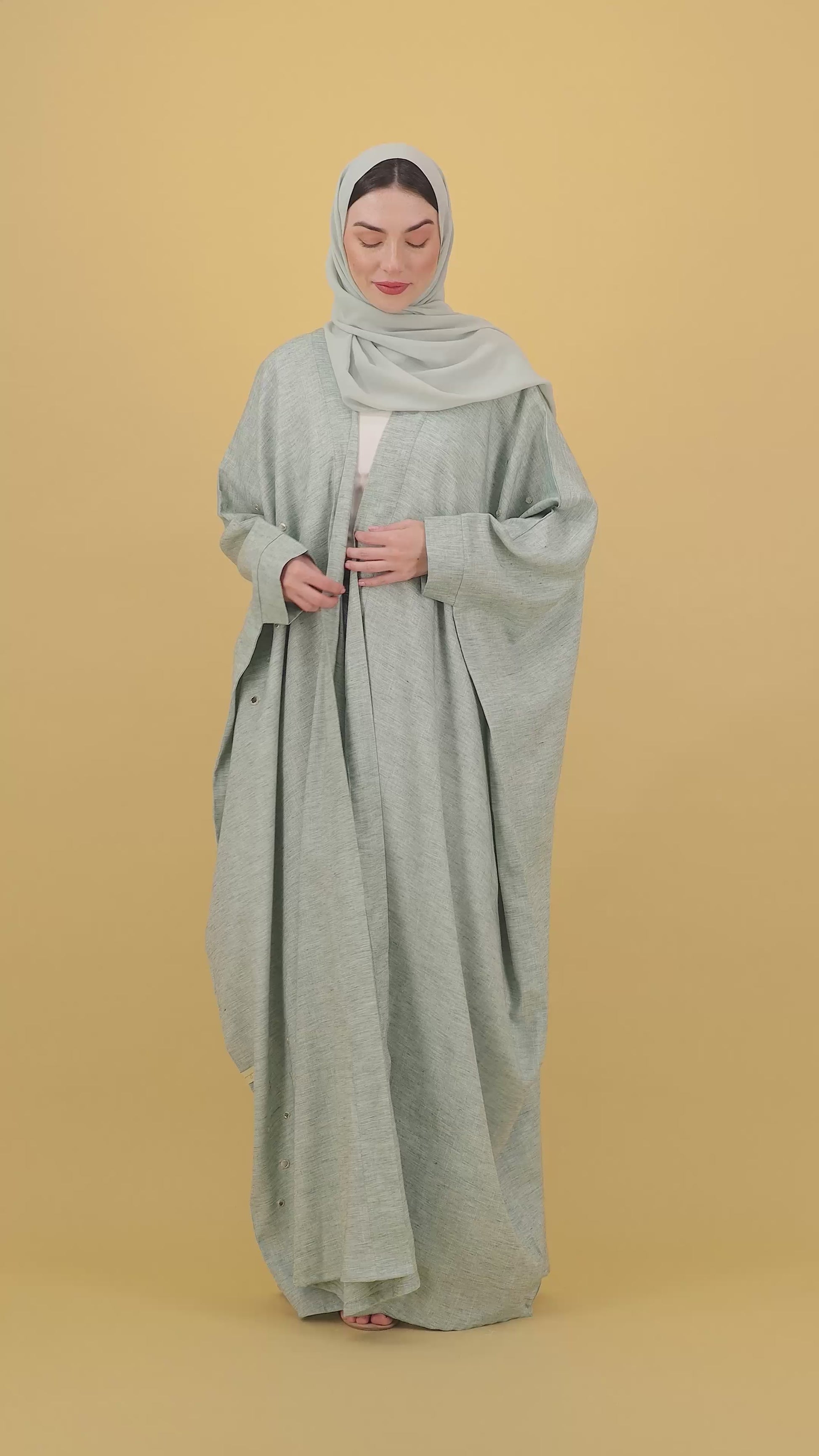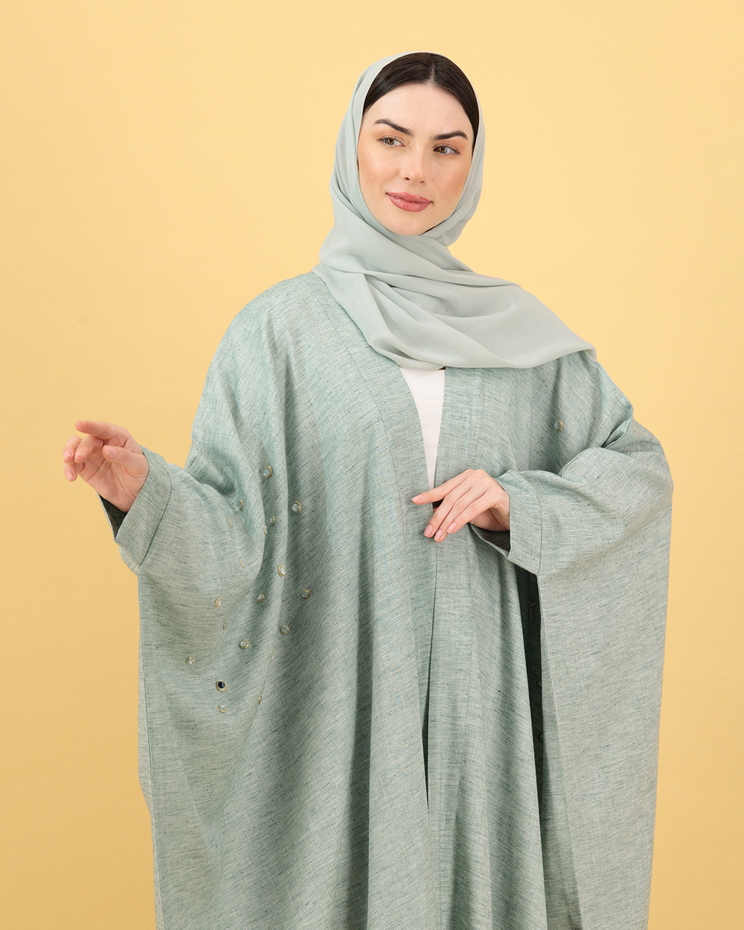 Soft, breathable fabric in a tranquil mint hue flows effortlessly in this abaya, offering a sense of calm sophistication. Subtle golden embellishments add just the right touch of refinement, making it ideal for both daytime ease and serene evenings. A timeless expression of grace in every fold.
