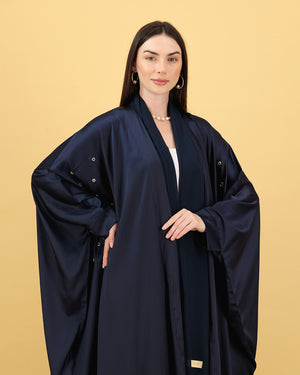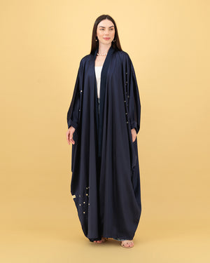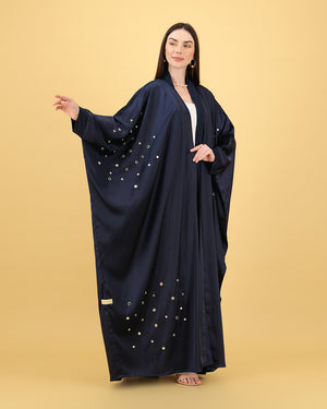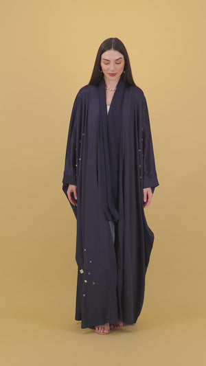 Draped in an inky navy hue, this abaya evokes the quiet elegance of twilight skies. Its flowing silhouette is elevated with glinting embellishments that catch the light like stars, while its relaxed tailoring ensures graceful movement. Understated yet striking, it's a piece that speaks in whispers and captivates in glances.