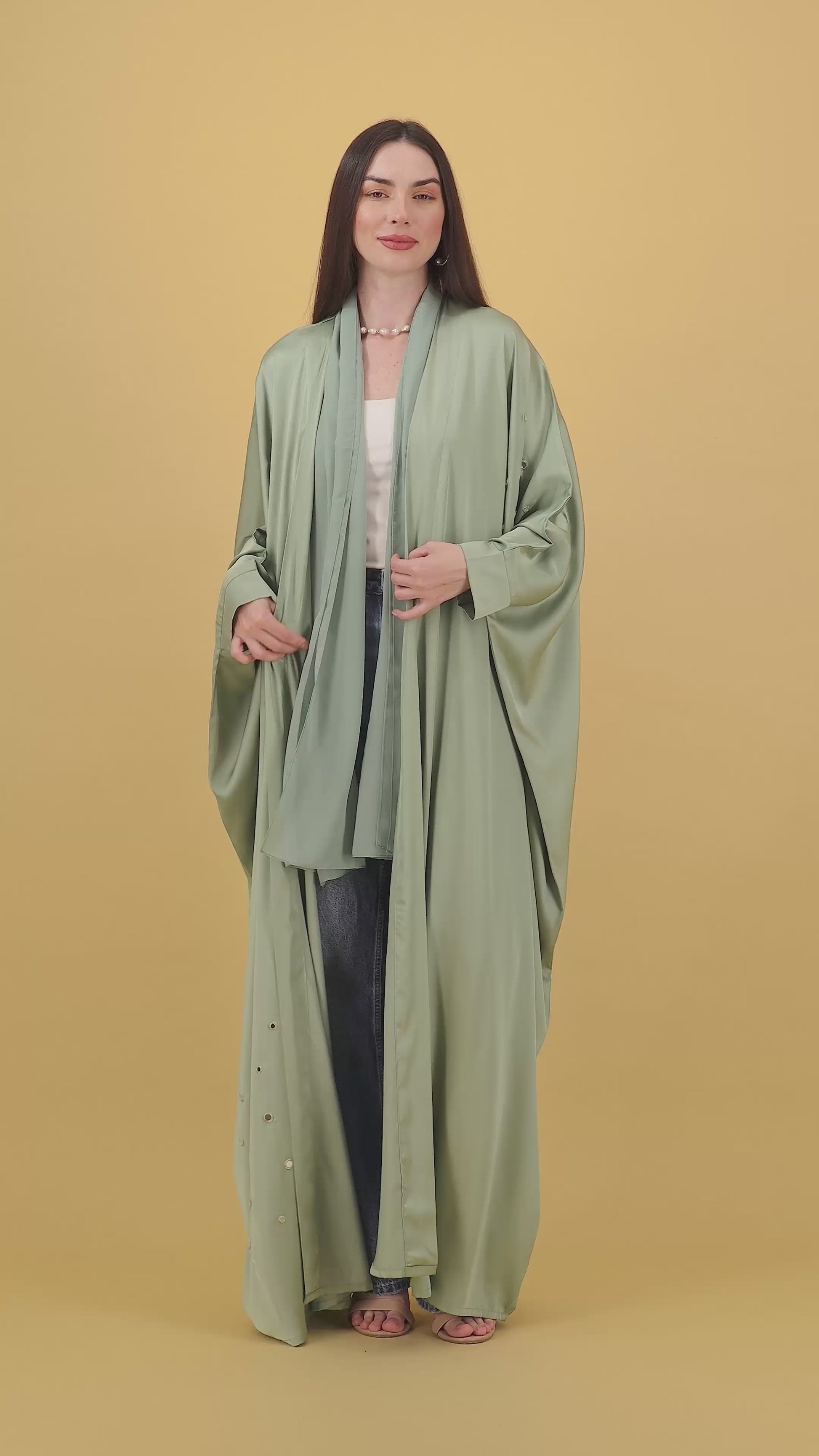 Step into the ethereal with Garden Mist—an abaya where earthy moss green drapes speak in soft whispers and jeweled pupils reflect nature’s quiet strength. A flowing silhouette that captures nature’s gaze in couture, blending organic elegance with understated opulence.