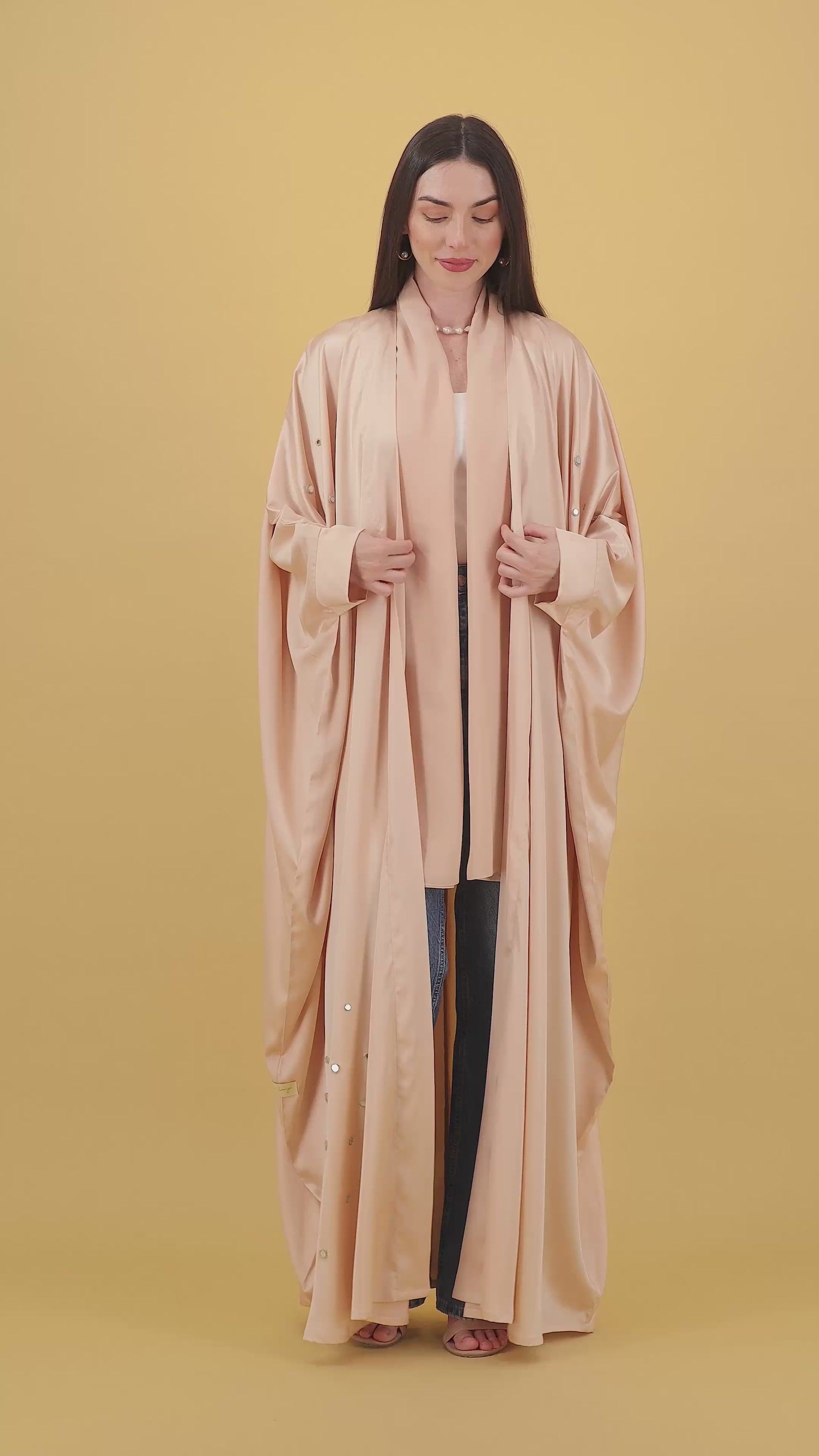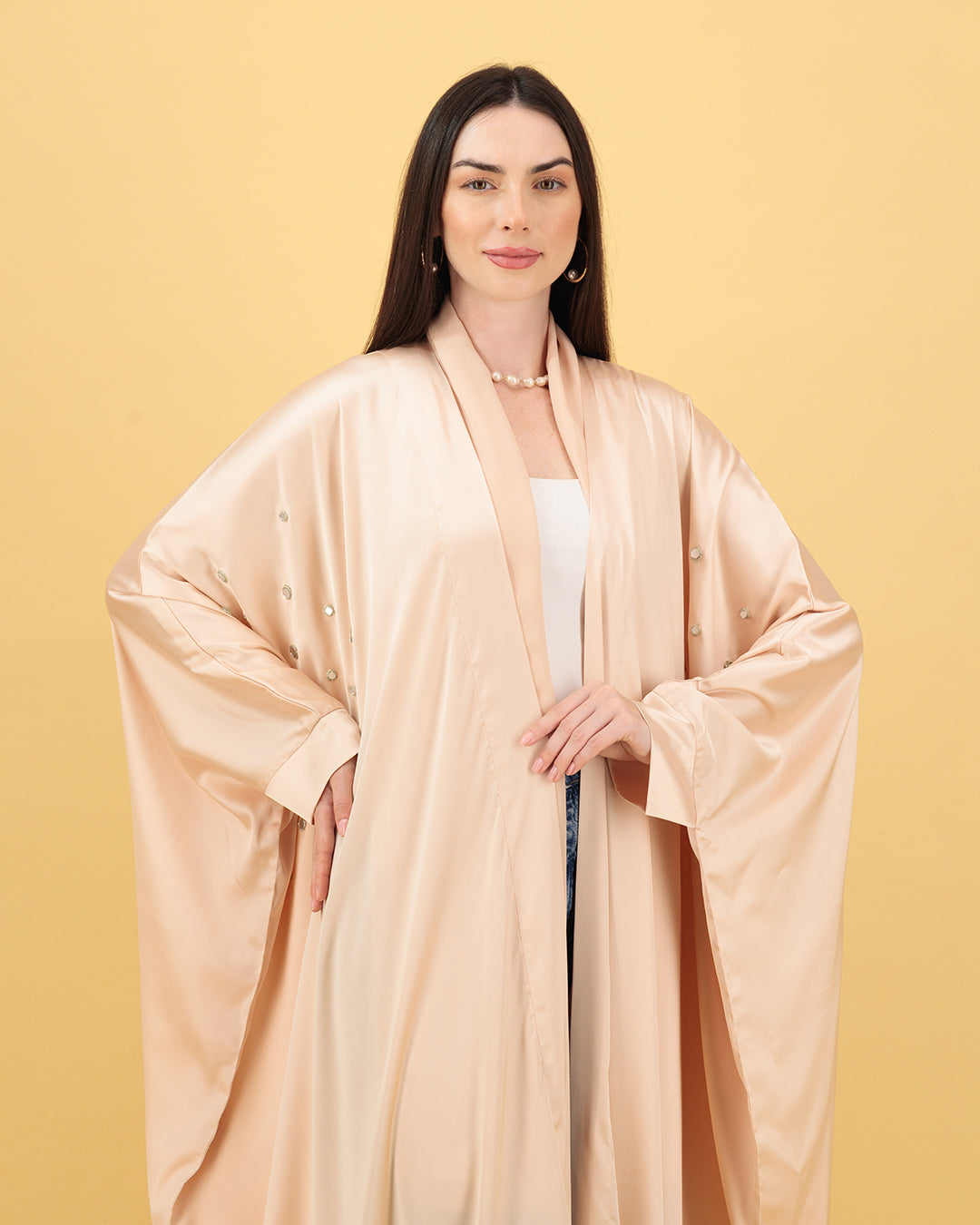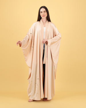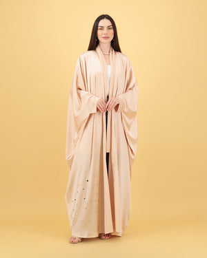 Embrace understated elegance in this soft peach satin abaya, where fluid draping meets refined femininity. Delicately adorned with scattered pearls and crystals, its gentle shimmer captures the essence of quiet luxury — perfect for graceful daytime looks or serene evening moments.