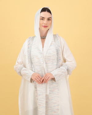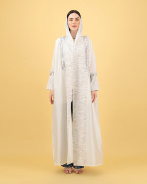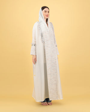 Ethereal in every thread, this soft white abaya features shimmering silver accents and delicate fringe detailing that catches the light with grace. Its lightweight fabric and subtle texture evoke a serene elegance—perfect for elevating your look from day to dusk.