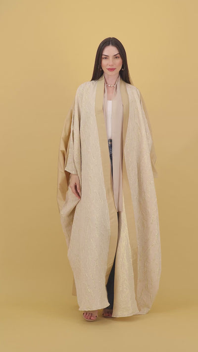 A graceful abaya in warm honey beige with a delicate gold woven pattern, designed to offer both elegance and comfort. The lightweight fabric and flowing silhouette make it perfect for refined everyday wear or special gatherings. Bathed in soft golden tones, this embossed creation captures the essence of desert sands kissed by couture sophistication.