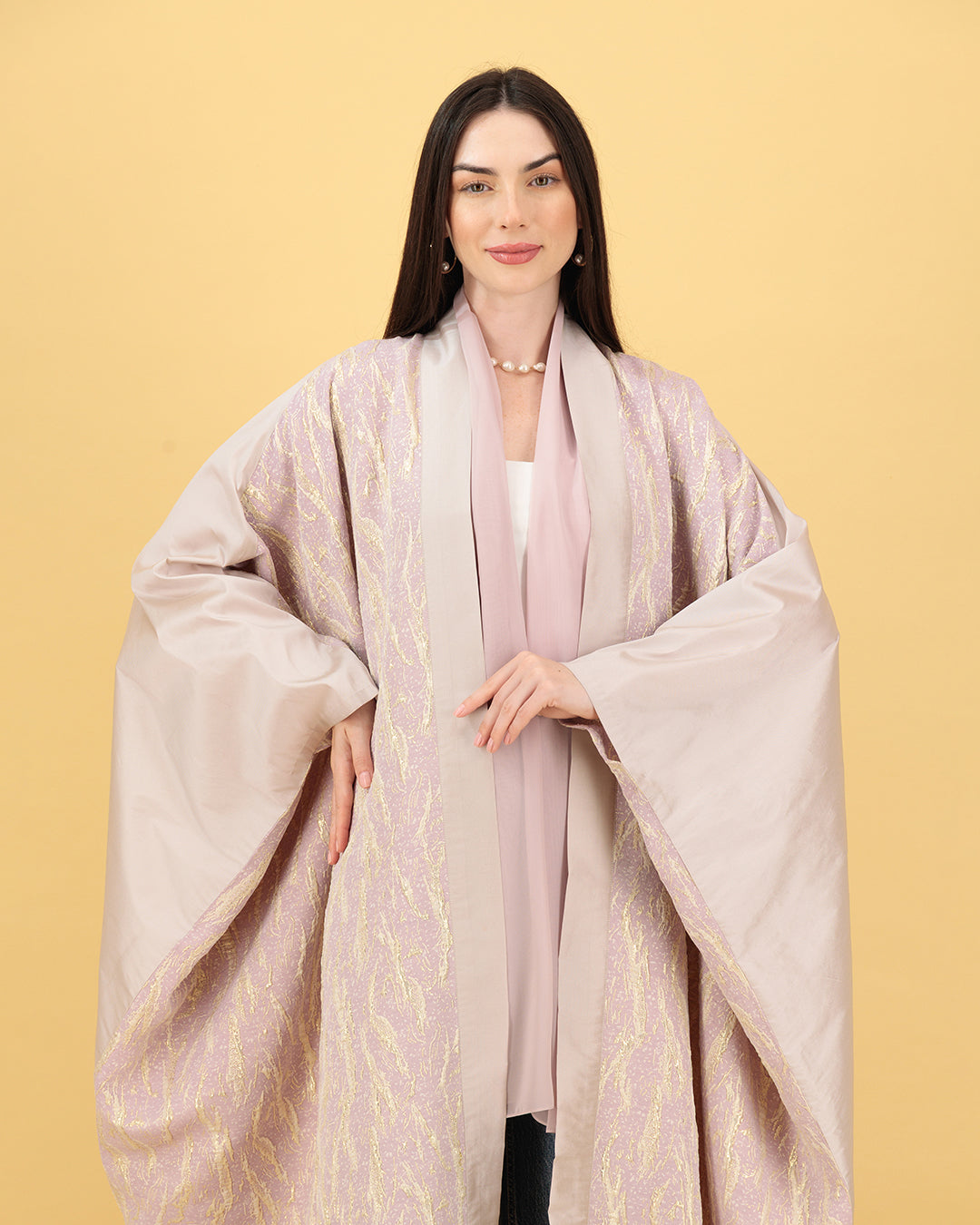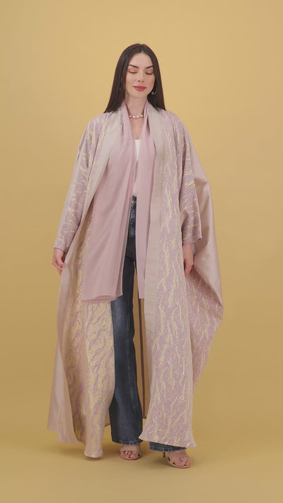 A graceful abaya in soft blush with a delicate gold woven pattern, designed to offer elegance and comfort. The lightweight fabric and relaxed silhouette make it a perfect pick for refined everyday wear or special gatherings.