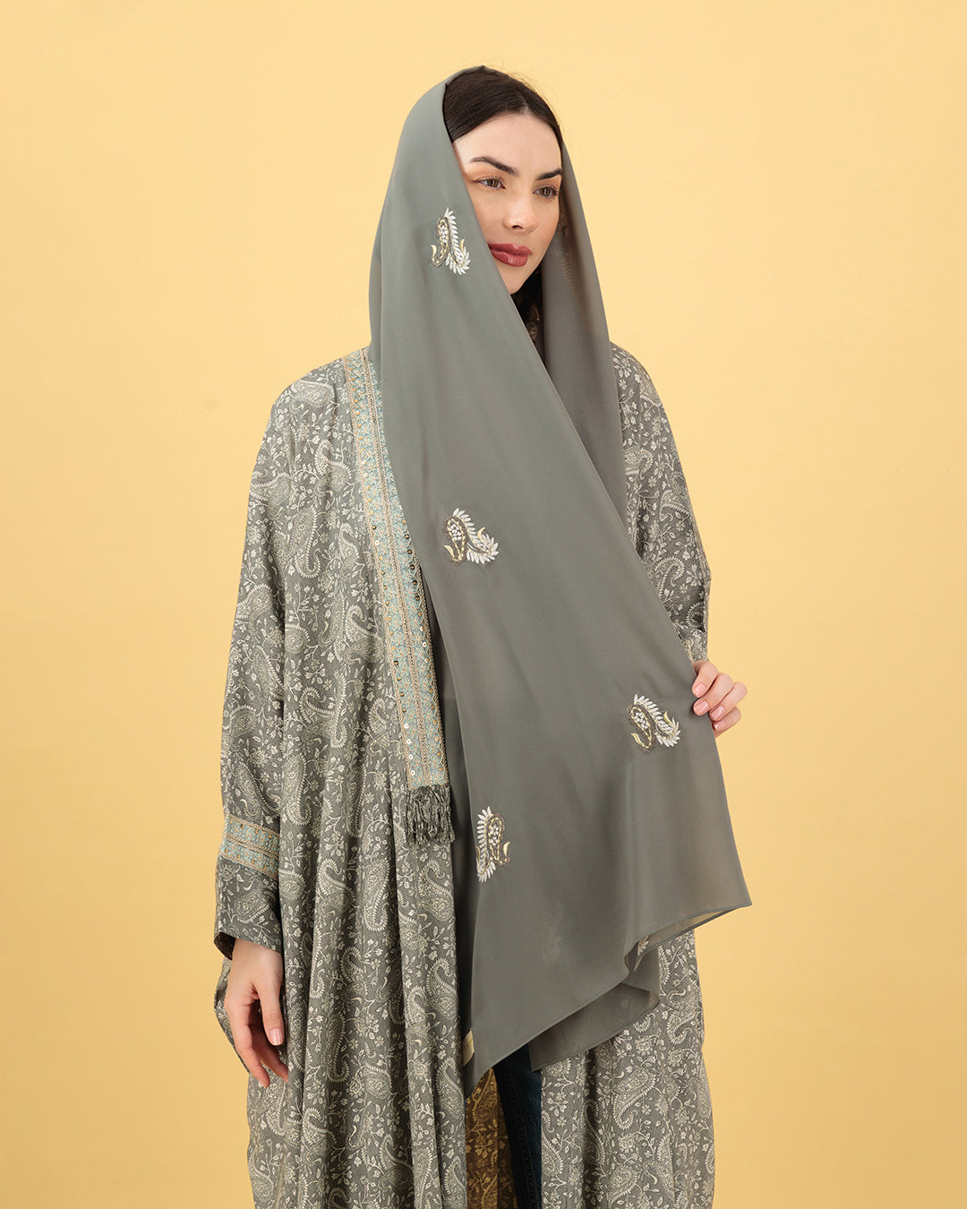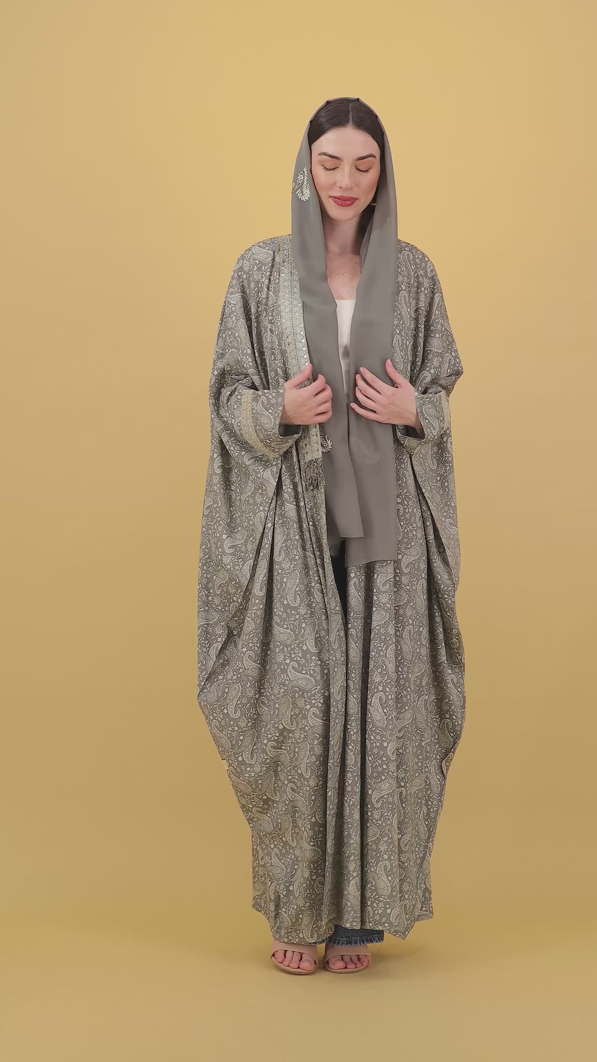 Refined and graceful, this sage green abaya features an elegant paisley print enhanced with delicate lace detailing along the front opening and sleeve cuffs. The flowing silhouette offers effortless modesty and style, perfect for special occasions or adding a touch of sophistication to everyday wear.