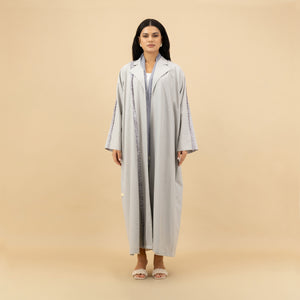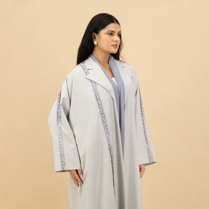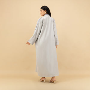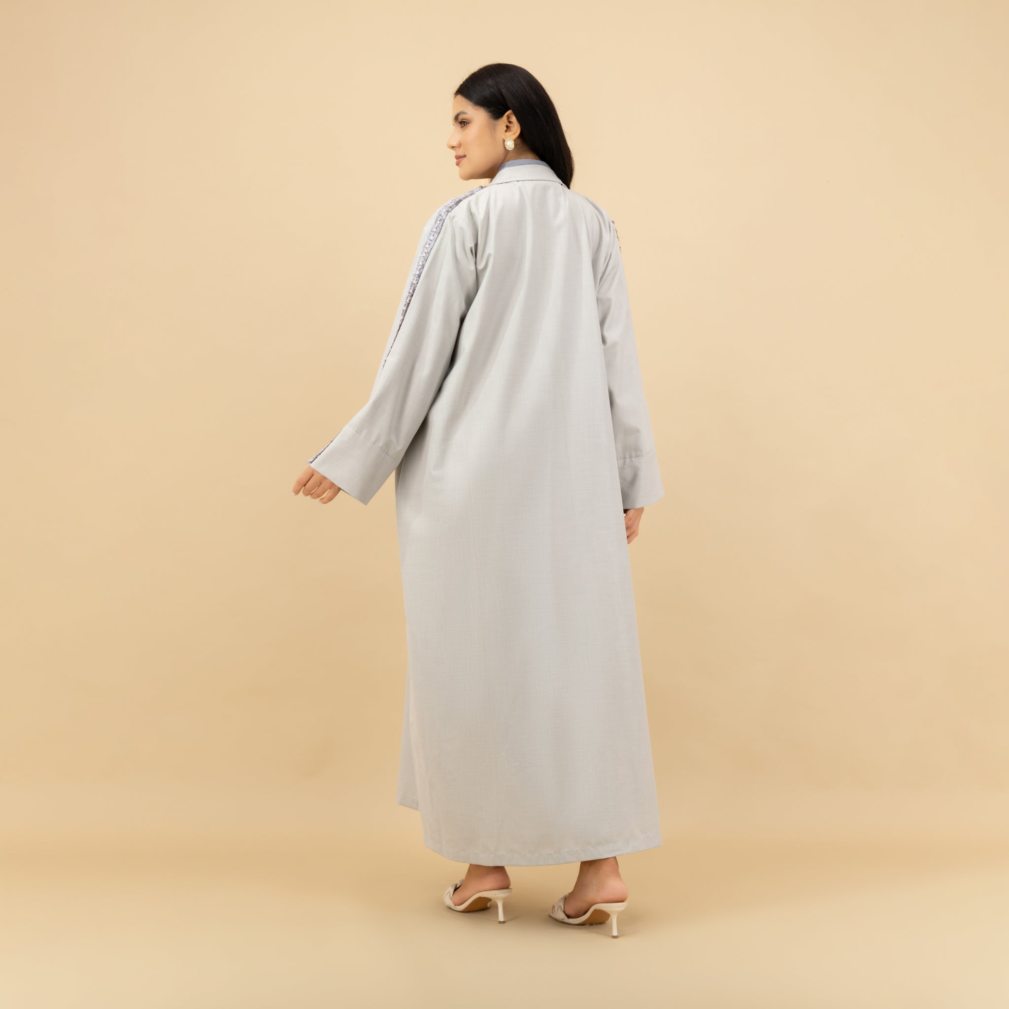 Refined and graceful, this Light Grey Abaya features delicate trim along the front placket and sleeves, adding a subtle touch of artistry. The relaxed, open-front silhouette is perfect for layering, offering effortless elegance for daily wear or special occasions. A timeless piece that balances tradition with contemporary style.