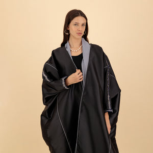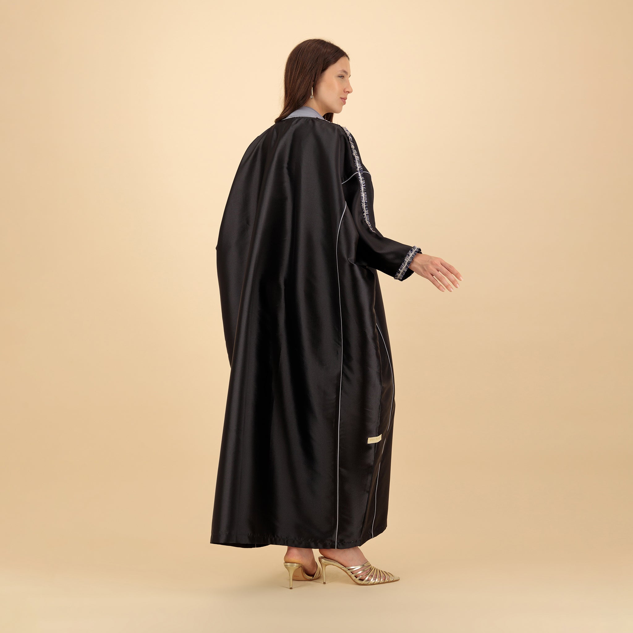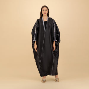 Embrace the elegance of simplicity with this flowing black satin abaya. Designed