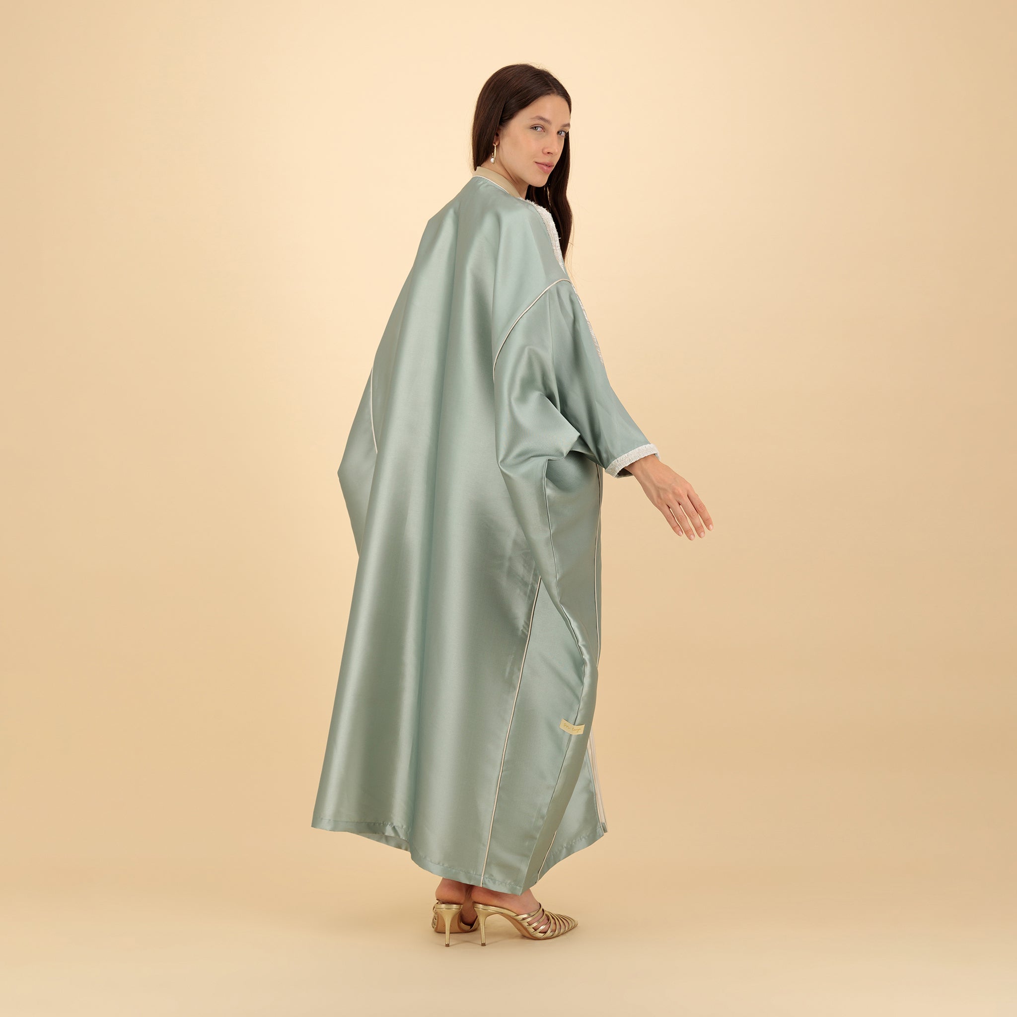 Embrace refined luxury with the Mint Opulence Satin Abaya, a timeless piece