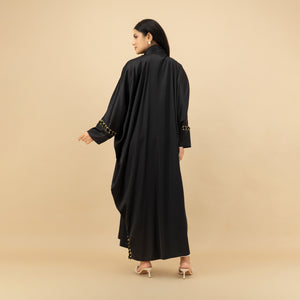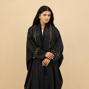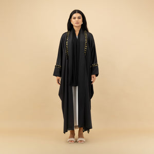 Elevate your wardrobe with this elegant black abaya featuring striking gold-accented trim along the front and sleeves. Designed with a flowing silhouette and luxurious fabric, it offers a refined look perfect for special occasions or everyday sophistication.