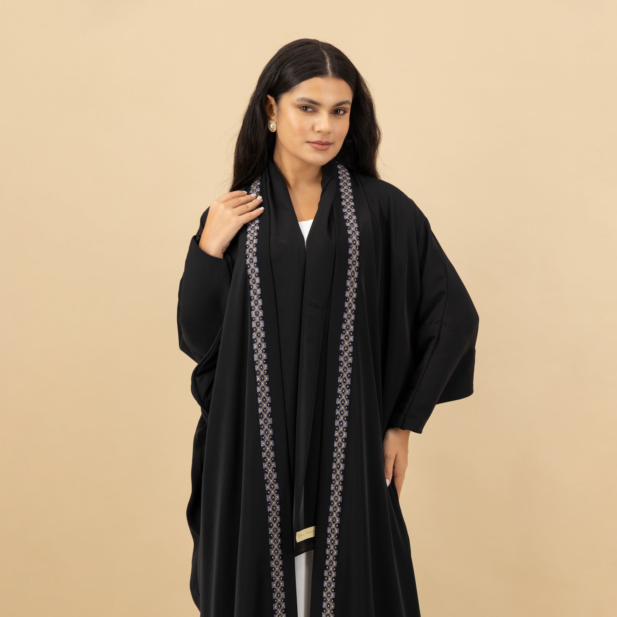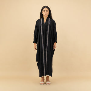 Timeless sophistication meets subtle artistry in this classic black abaya, adorned with delicate geometric embroidery running gracefully down the front. Crafted for comfort and elegance, the flowing silhouette offers ease of movement while maintaining a polished look. A versatile choice for both everyday refinement and special occasions.