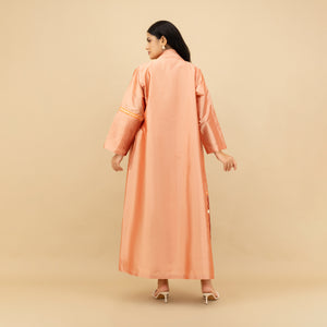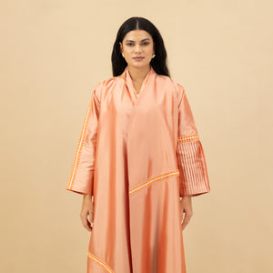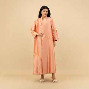 Radiate confidence in this luxe peach-toned abaya, crafted from rich satin with pleated sleeve accents and diagonal beaded trims. A perfect fusion of modern flair and timeless elegance for statement-making occasions.