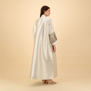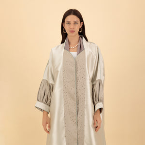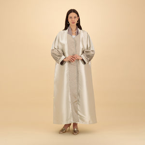 Elegant beige Taffeta abaya with a mix touch of Jacquard fabric.