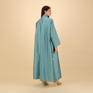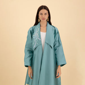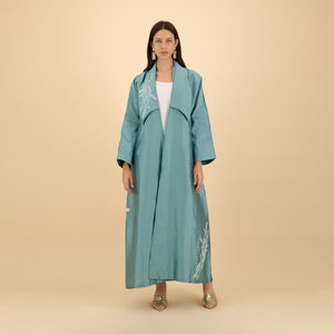 Elegant abaya in sapphire taffeta fabric with a beautiful floral embroidery.