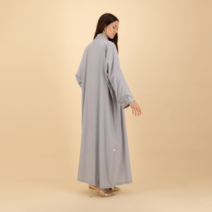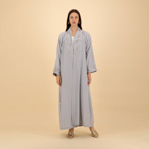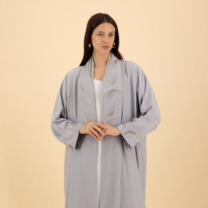 Elegant and understated, this light grey abaya features refined leaf-pattern detailing along the collar and cuffs. Its flowing silhouette and soft fabric make it a graceful choice for both casual and formal occasions. The neutral tone enhances its versatility, while the subtle design adds a modern flair.