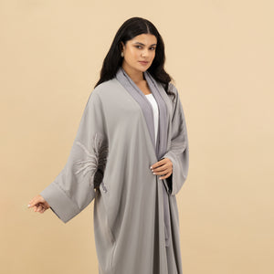 Ethereal Gray Draped Abaya with Artistic Sleeve Embroidery