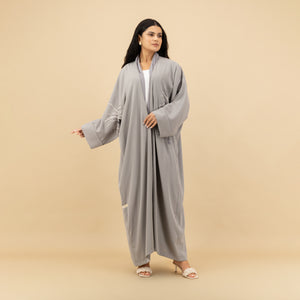 A statement in refined elegance, this high-fashion gray abaya features sculptural draping and delicate embroidery for a look that blends contemporary grace with timeless modesty. Ideal for elevated everyday wear or special occasions.