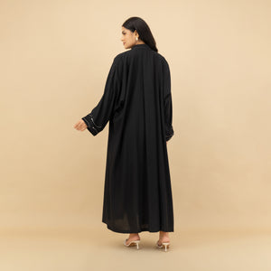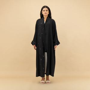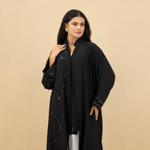 Elegant abaya in Black blended stripe fabric with a beautiful black feather embroidery design.